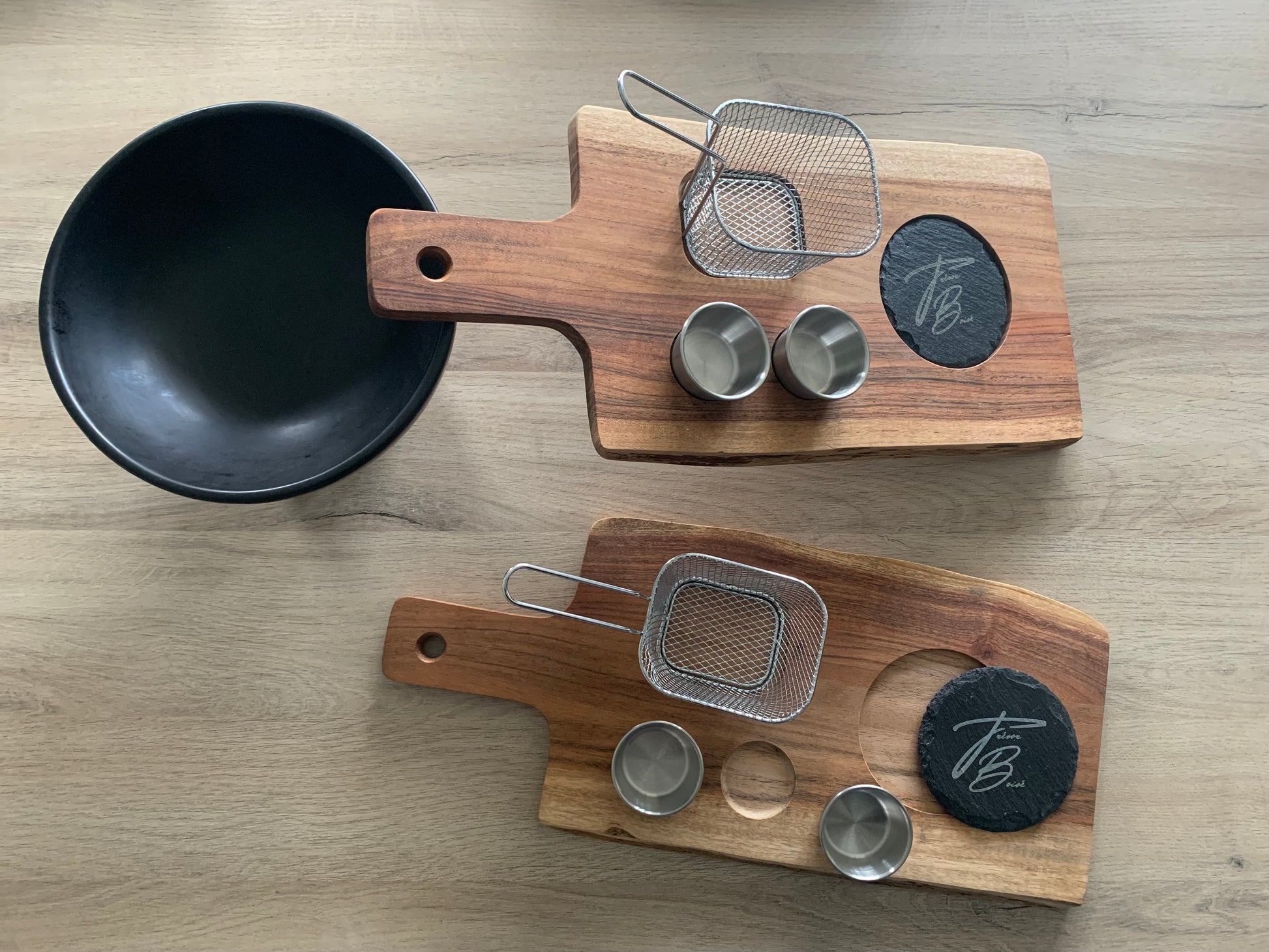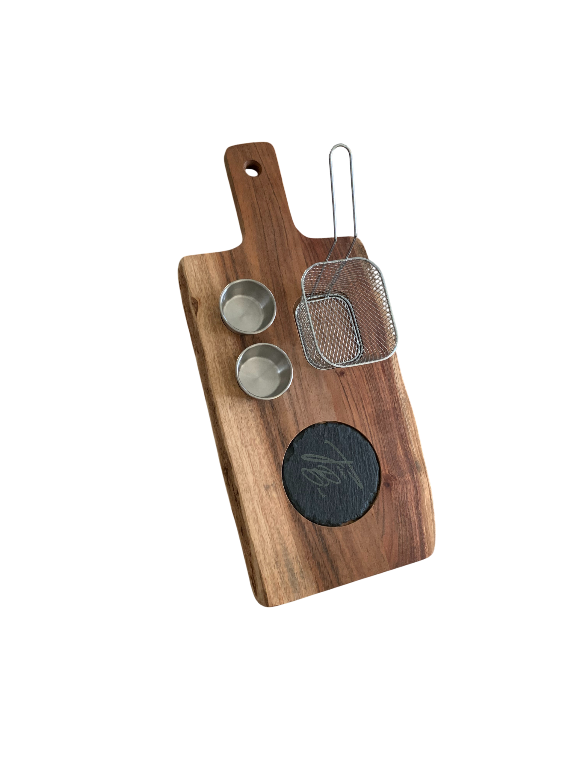 D’un côté, une surface sculptée avec précision accueille deux coupelles à sauce, une ardoise et un panier à friture ; un véritable plateau de service pensé pour sublimer vos entrées, tapas, burgers ou apéritifs gourmets.